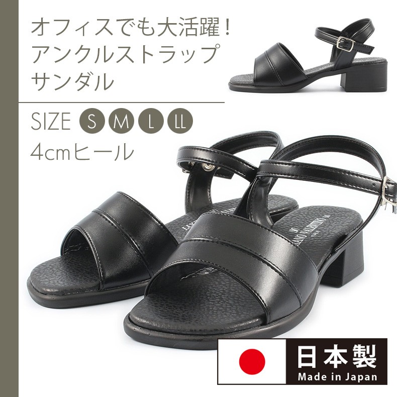 【7,560円以上送料無料】【あすつくOK/メール便不可】◆日本製 オフィスに最適!4cmヒール アンクルストラップ サンダル◆ 高すぎず低すぎない、オフィスに最適な高さの4cmヒール。お散歩やちょっとしたお買い物などにも。※撮影は室内で行われており、ライティングにより実物と色味が少し異なる場合がございます。■足幅…8.0/8.2/8.4/8.6cm (S-LL)■ウィズ…EEE程度■ヒール…4cm■ストーム…1cm■素材…合成皮革■片足重量…170-200g (S-LL)■生産国…日本■商品コード…IM-3640