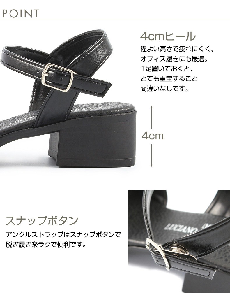 | ポイント | 【7,560円以上送料無料】 【あすつくOK/メール便不可】 ◆日本製 オフィスに最適!4cmヒール アンクルストラップ サンダル◆ 高すぎず低すぎない、オフィスに最適な高さの4cmヒール。 お散歩やちょっとしたお買い物などにも。 ※撮影は室内で行われており、ライティングにより実物と 色味が少し異なる場合がございます。 | |||||