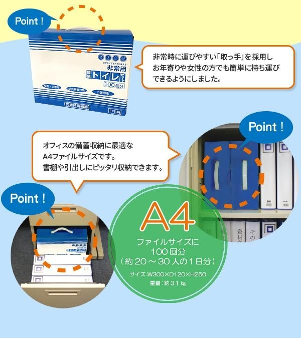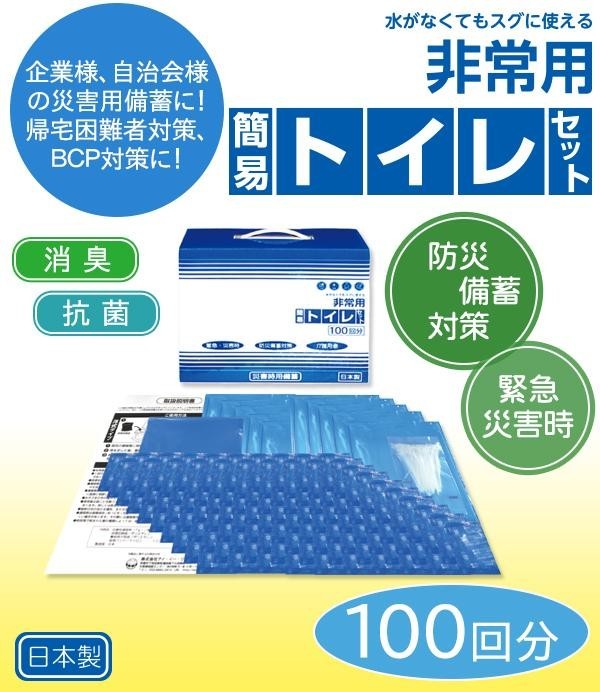 地震等の災害時など様々な緊急時の排泄問題を解消する為に開発された水がなくても使える簡易トイレセットです。企業様や自治会様で備蓄用に便利な100回用です。 |
