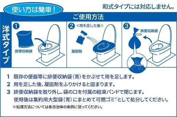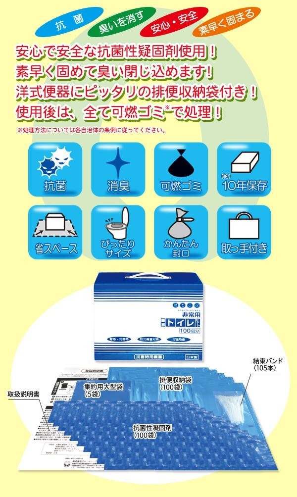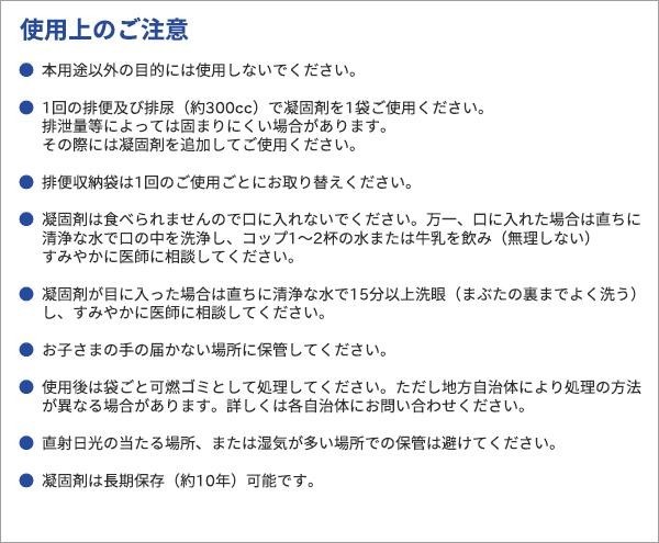 | セット内容 | 抗菌性凝固剤(7g)×100 排便収納袋(650mm×500mm)×100 結束バンド×105 集約用大型袋×5 取扱説明書 |
