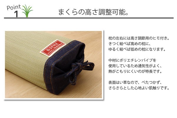ヘリ部分に国産デニム生地を使用したイ草枕です。枕の左右には高さ調節用のヒモ付き。左右のヒモをきつく結べば高めの枕に、ゆるく結べば低めの枕になって便利です。快眠い草の効能として1.綿の約2.5倍の吸湿力 2.蒸れにくい。汗による湿気を吸うことにより温度を下げ快適な就寝を促します。 3.汗のにおいを軽減。汗のにおいの元となる化学物質を90%以上抑えます。などがあります。国産(九州産)のしなやかなイ草を使用していますので、柔らかく、すべすべしたとした肌触りです。中材には通気性のよいポリエチレンパイプを使用しています。パイプのため通気性がよく、熱がこもりにくいのが特長です。い草の表面に天然青森ヒバ加工を施しています(抗菌・防臭効果)。青森県のヒバの木から抽出した「ヒバ油」をメーカー独自の技術で材料や商品に加工しました。「ヒバ油」には、ヒノキチオールという天然物質としては極めて抗菌性の高い成分が含まれ、医療や食品など多分野で利用研究が進められています。