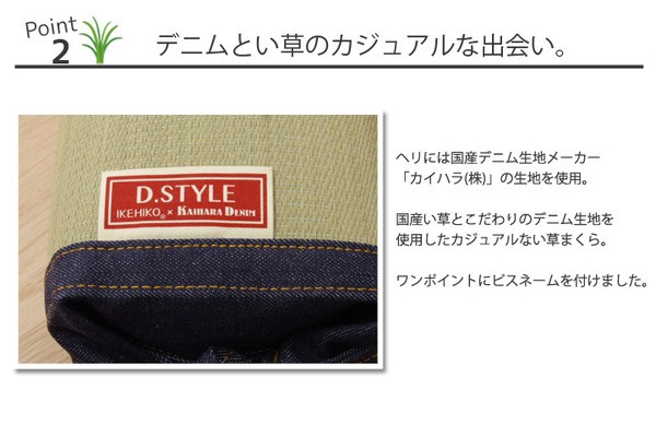 【素材】側地=い草(九州産)※メセキ織 中材=ポリエチレンパイプ100% ヘリ=綿100%【デニム】