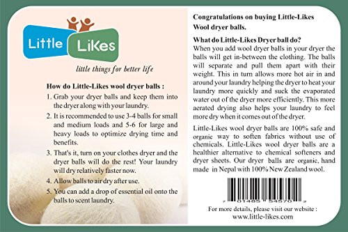 100% NATURAL FABRIC SOFTENER - Little-Likes wool dryer balls are a replacement for dryer sheets and liquid fabric softeners. These are purely natural with no chemicals or synthetics. Our balls helps to get soft, fluffy, wrinkle and static free clothes. The balls are non-toxic and hypoallergenic, a definite advantage for people with sensitive skin, allergies and for babies/toddlers.