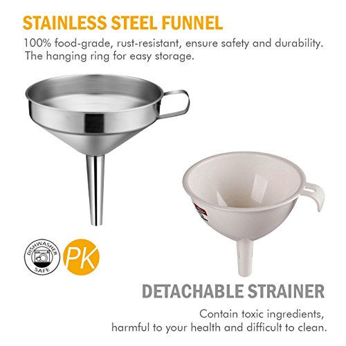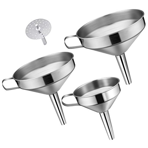 - 3 Assorted sizes Funnels and 1 Strainer. The 3 pieces funnel set includes 4.1", 4.9" and 5.6" diameter of the mouth for your different needs. And 1 removable strainer is included helping prevent clogging of the stem.