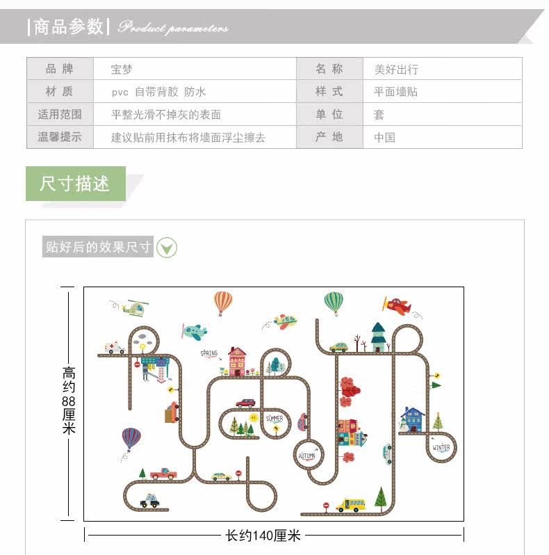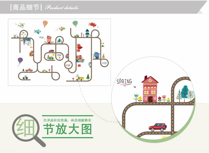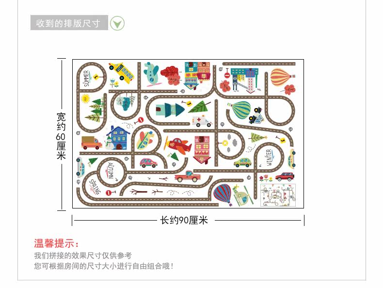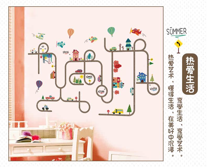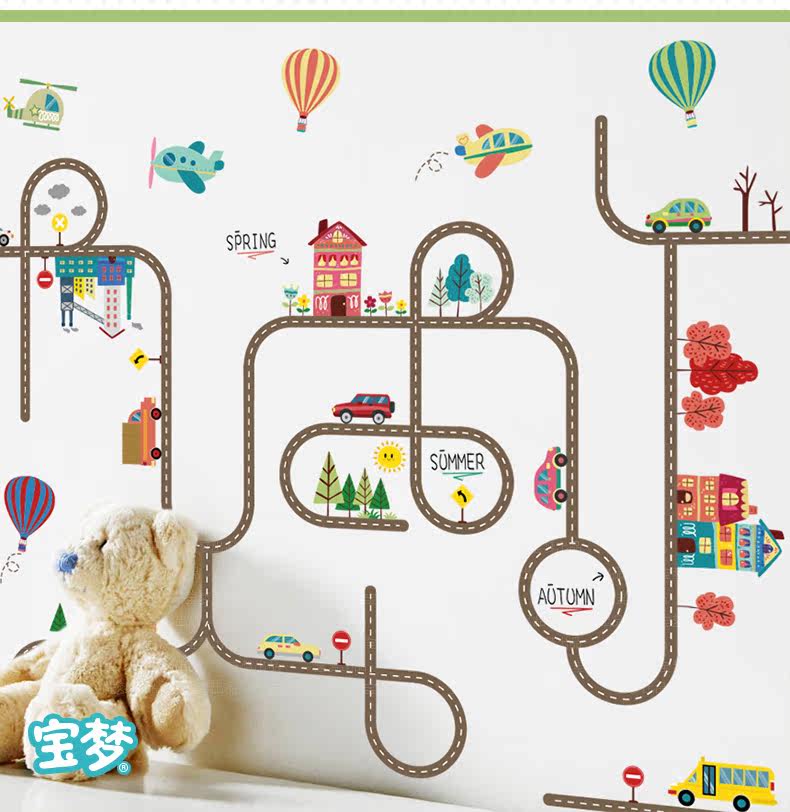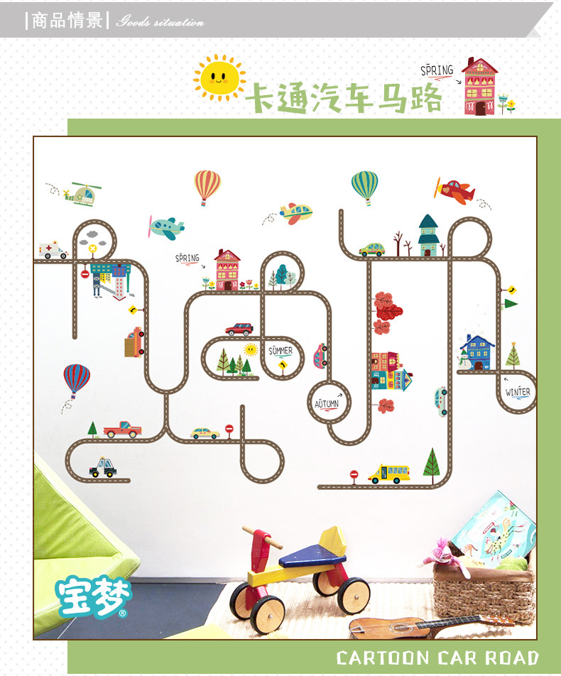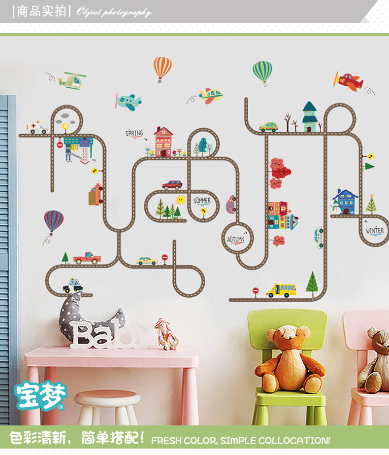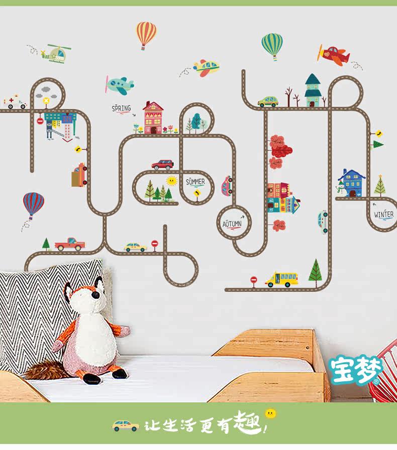 卡通儿童房宝宝卧室床头墙贴纸汽车马路装饰品幼儿园可爱背景贴画