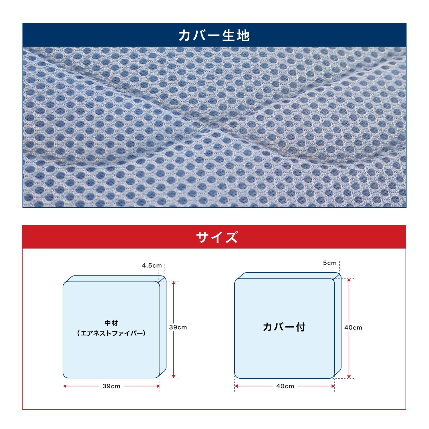 【サイズ:厚さ50mm×幅400mm×長さ400mm(エアネストファイバー:厚さ45mm×幅390mm×長さ390mm)】【素材:側生地/ポリエステル100%、詰めもの/エアネストファイバー】【カラー:サックスブルー】