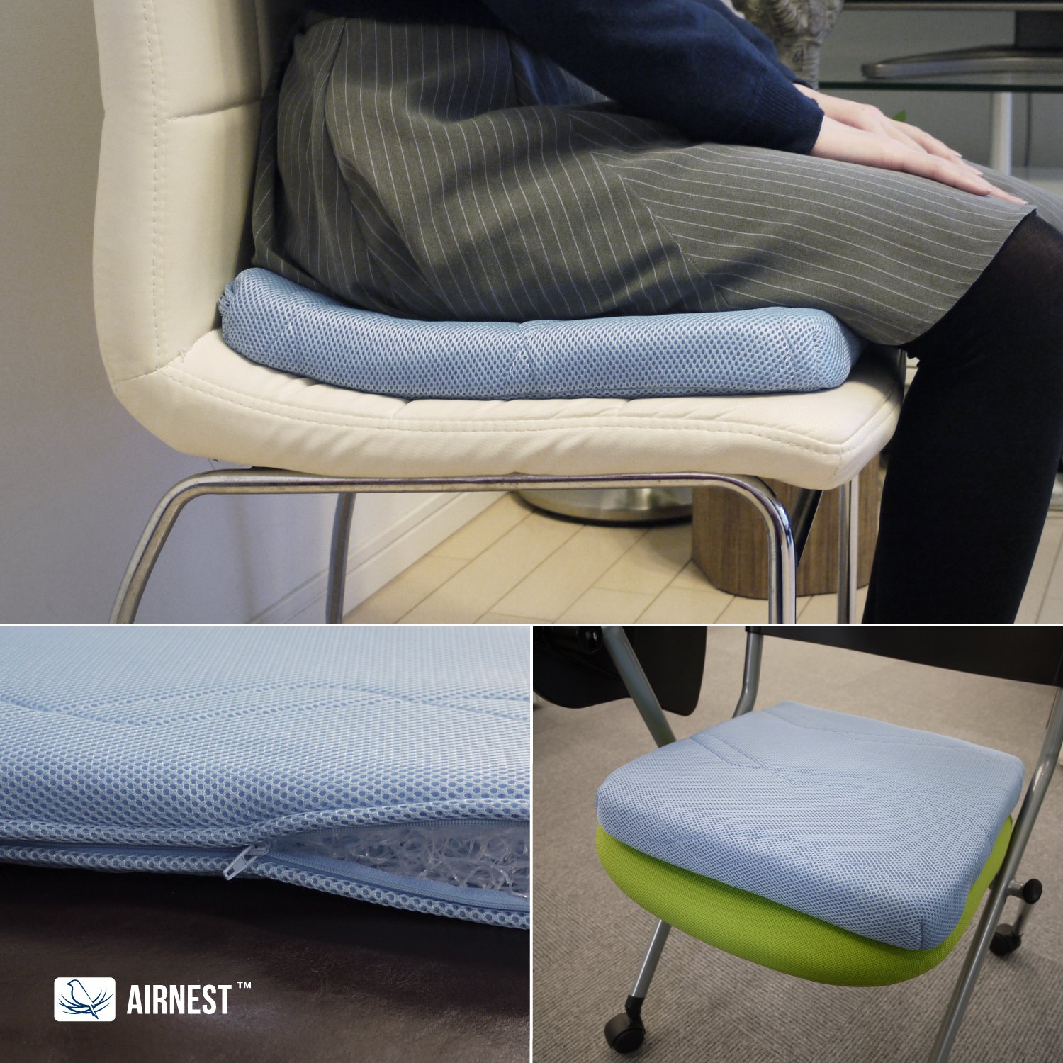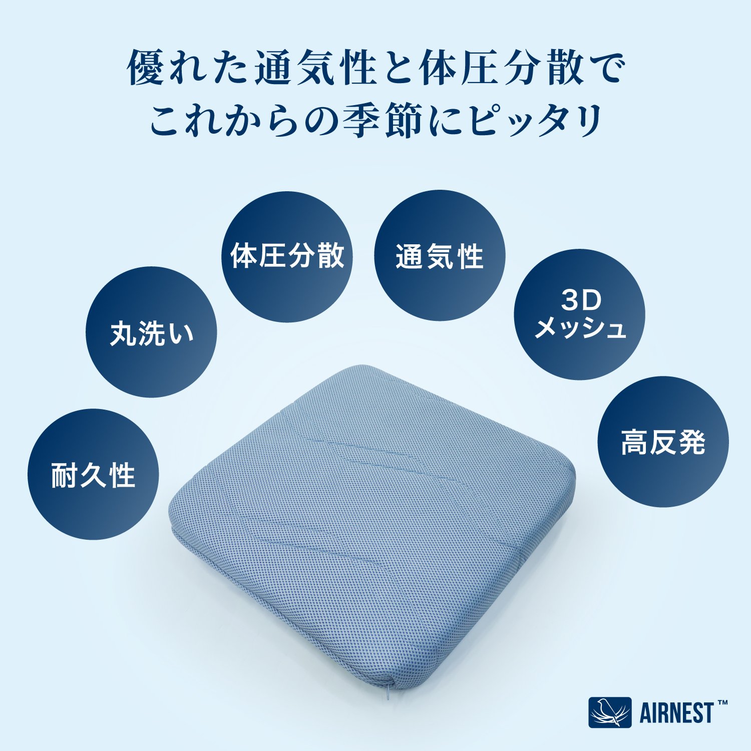 【汗による蒸れを軽減1年中使える】エアネストは空気を含んだ構造なので、綿やウレタンに比べ抜群の通気性です。またカバーもメッシュ仕様で湿気を逃し蒸れにくい構造だから、長時間座っていても快適にご使用いただけます。