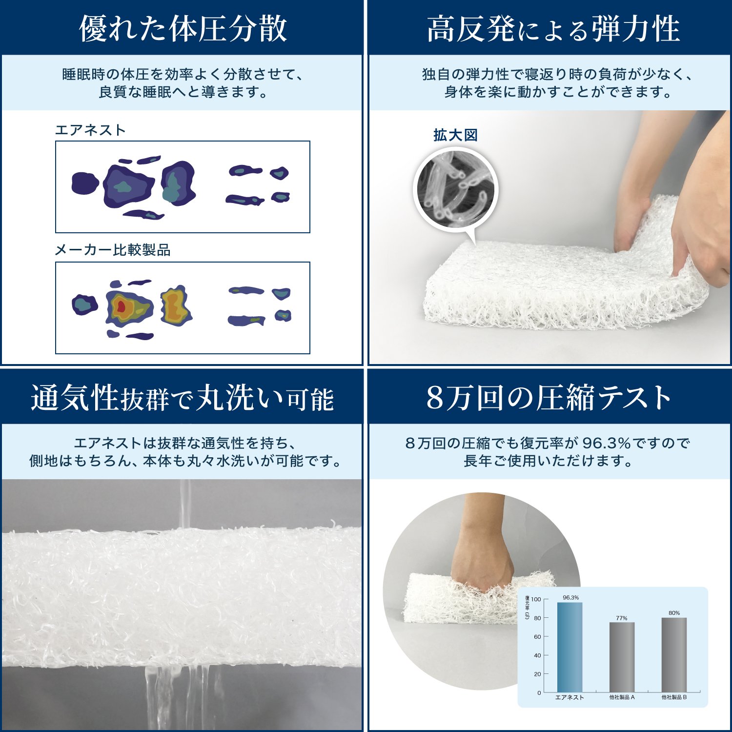 【復元性と耐久性】しっかり身体を支え高い反発力で座った姿勢を楽にします。身体の動きにスムーズに反応し、しっかり体重を押し返すので自然な姿勢で腰や背中への負担が少ないです。また日本国内検査機関にてエアネストシリーズは約8万回の圧縮テストした結果、復元率96.3%と優れた耐久性を証明されました。
