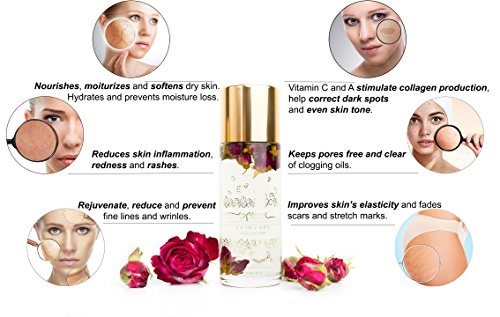 NATURAL TREATMENT FOR SKIN CONDITIONS - this blend of precious oils such as organic jojoba oil, organic rosehip seed oil, sweet almond oil, grapeseed and apricot kernel oils is rich in antioxidants, fatty acids and vitamins that help fight against most frequent skin conditions such as dry skin, breakouts, clogged pores, stretch marks, dark spots and any other signs of aging.