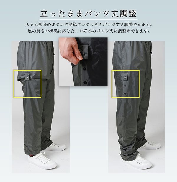 ●二輪車に乗った時と歩行時のパンツ丈を太もも横のボタンで調整出来ます。(最大12cmの丈調整が可能です。)