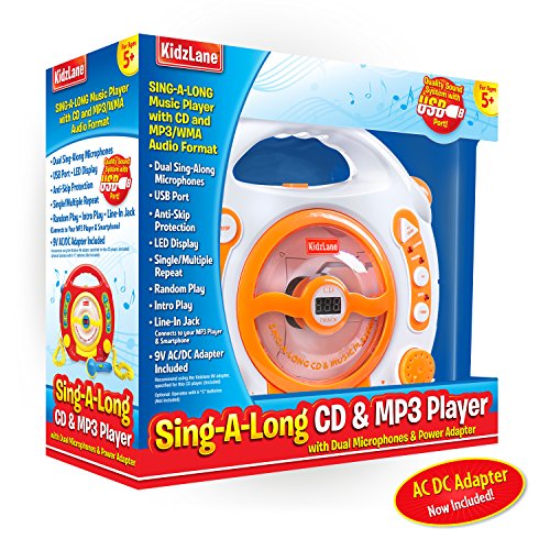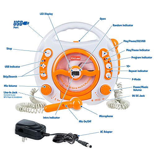 The portable KIDZLANE Kid's CD Player will provide hours of fun and entertainment for your children. It is powered by six 'C' batteries making it easy for kids on the go to pick it up and take it with them. The anti-skip feature means you can take it with you on play dates, sleepovers, trips to the park, or pool parties without skipping a beat! The two kid karaoke sing-along dual microphones will put an end to turn-taking battles, and will promote cooperation among the users. The powerful output will delight children as they listen to their voices ring out through the high-quality speaker sound system. For those times when you don't think that your child's voice is as fabulous as they do, there is a separate microphone volume control knob, and ON/OFF switch! The Karaoke Machine for kids is fully programmable, so you decide which tracks to play and how you want to play them. There are random play, intro play, and repeat play features that let you customize your music listening experience. The LED display lets you easily see which mode you are in. The Kid's CD Player includes a free AC adapter, so you can plug and play when you get it home, or any time your batteries are running low. You can listen to your digital tracks with an external USB flash drive that reads all audio formats. It is recommended that you purchase the KIDZLANE USB Flash Drive that is specially made to be used with the Karaoke Machine For Kids. The line-In Jack is perfect when you want to connect your Kid's CD Player with your smartphone or MP3 player. The Karaoke Machine For Kids is a great gift idea for anyone that loves to listen to music and sing along to songs. Look no further for the most fun and entertaining gift that you can give to your niece, nephew, son, daughter or grandkids. Buying a gift that they will love has never been easier.Feature