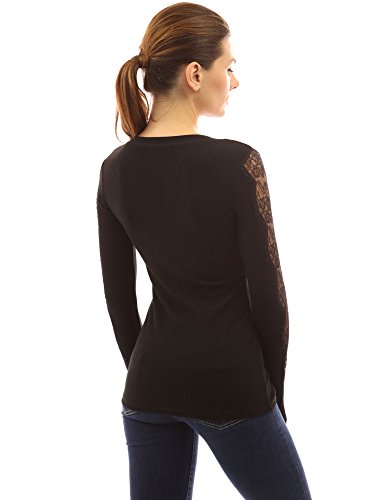PattyBoutik Notch Neck Lace Inset Long Sleeve Ribbed Top. Model in pictures is 5 feet 8 inches (173cm) tall wearing size S.