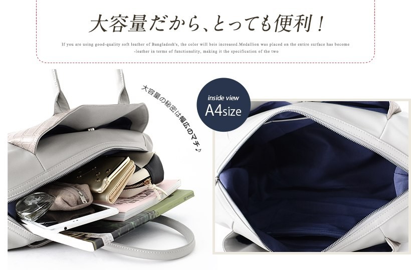 ●SIZE:高さ:約23cm / 幅:約38cm/ マチ:約15cm●ハンドル長さ:約50cm×幅:約1.7cm、持ち手高さ:約19cm●外ポケット:前面マグネット付きポケット1、背面マグネット付きポケット1●内ポケット:オープンポケット4、ファスナー付きポケット2●重さ:約790g●素材:合成皮革●バッグのメイン開閉口はファスナーになっております。[カラー]ブラック・グレーベージュメーカーより取り寄せ商品のため、在庫状況によっては欠品・廃盤の可能性があります。あらかじめご了承ください。
