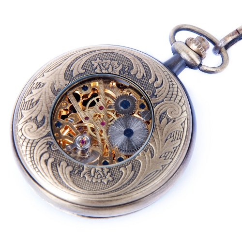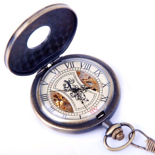 -. Feature : Full Hunter Pocket Watch with a Bronze Tone Metal Case / Skeleton Dial with Roman Numerals / ShoppeWatch Brand with Gift Box / Hand Wind Mechanical Movement. Chain Length 14 inches / Quality Mechanical Wind Up Pocket Watch