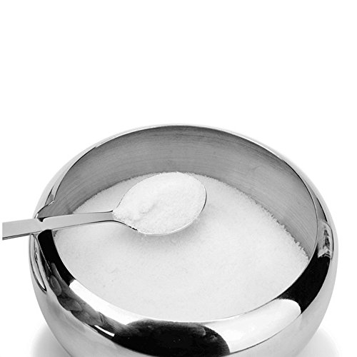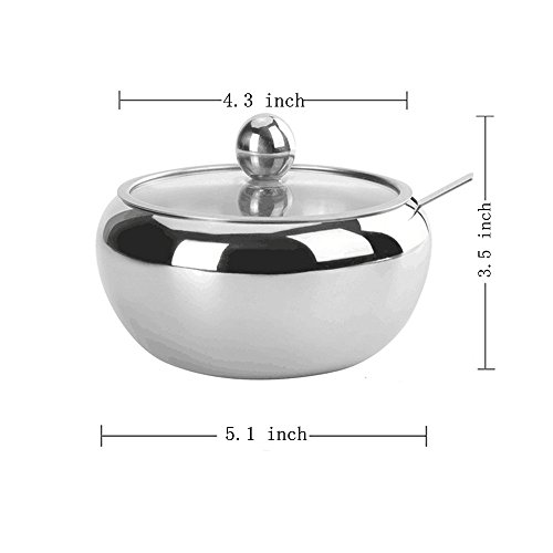 Sugar Bowl, Stainless Steel Sugar Bowl with Toughed Glass Lid ( for clearly recognize volume) and Sugar Spoon, Drum Shape, 12.7 ouces (560 Milliliter)