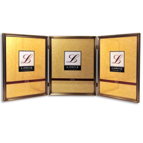 -. Binding : Misc. -. Brand : Lawrence Frames -. Color : Gold -. Department : Home Décor -. EAN : 0751148065269 -. Feature : Traditional brass metal frame that will compliment any décor / Constructed of heavy weight metal; includes high quality black velvet backing / Traditional narrow high quality brass finish frame / Wipe clean with dry cloth -. Label : Lawrence Frames -. Manufacturer : Lawrence Frames -. Model : 11480T -. MPN : 11480T -. NumberOfItems : 1 -. PackageQuantity : 1 -. PartNumber : 11480T -. ProductGroup : Home -. ProductTypeName : HOME -. ProductTypeSubcategory : other-professional-frames -. Publisher : Lawrence Frames -. Size : 8 x 10 Hinged Triple -. Studio : Lawrence Frames -. Title : Lawrence Frames 11480T Antique Gold Bead Hinged Triple Picture Frame, 8 by 10-Inch -. UPC : 751148065269