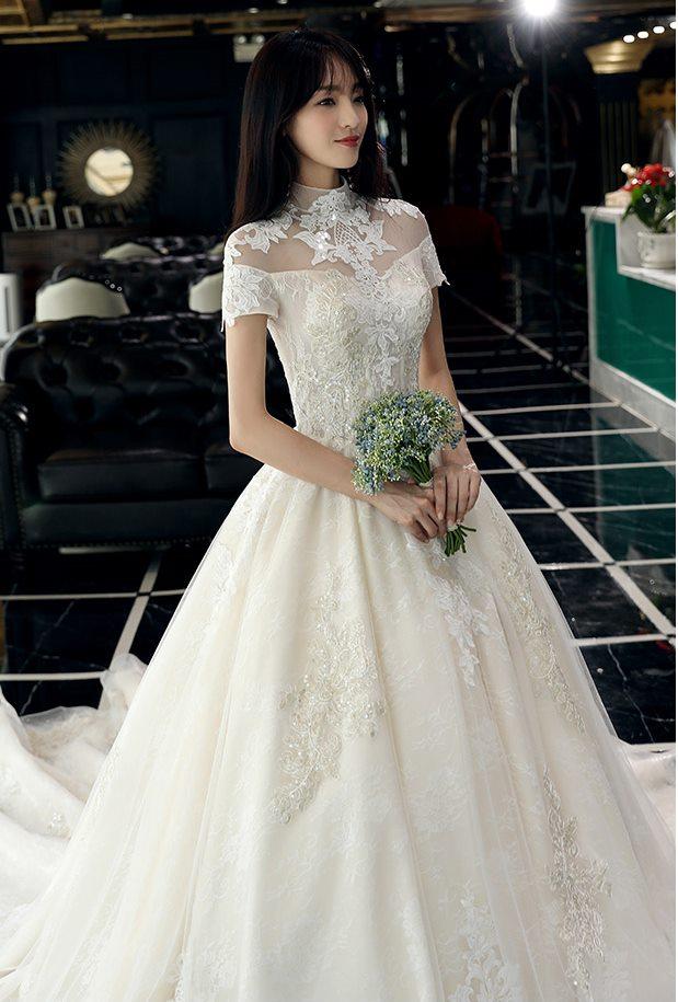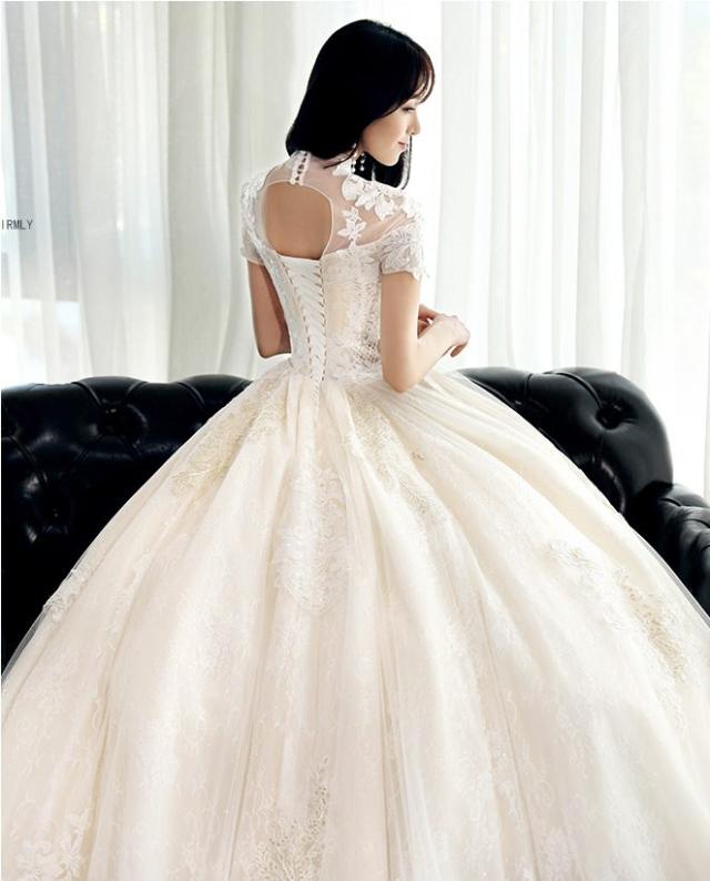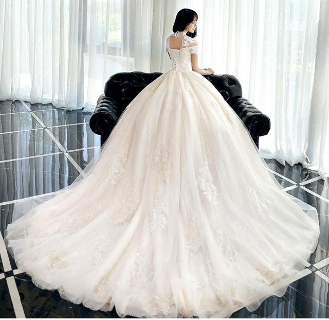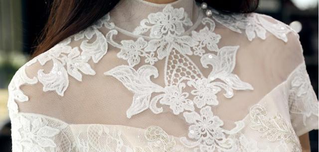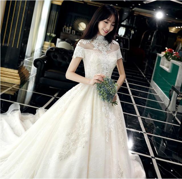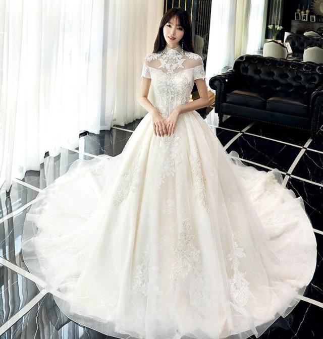 スタンドカラー付きのヴィンテージ風ウェディングドレス。