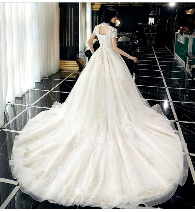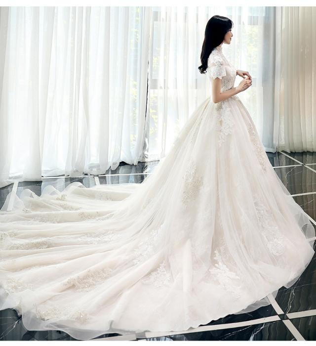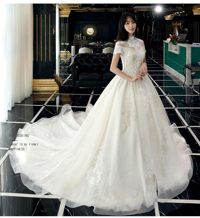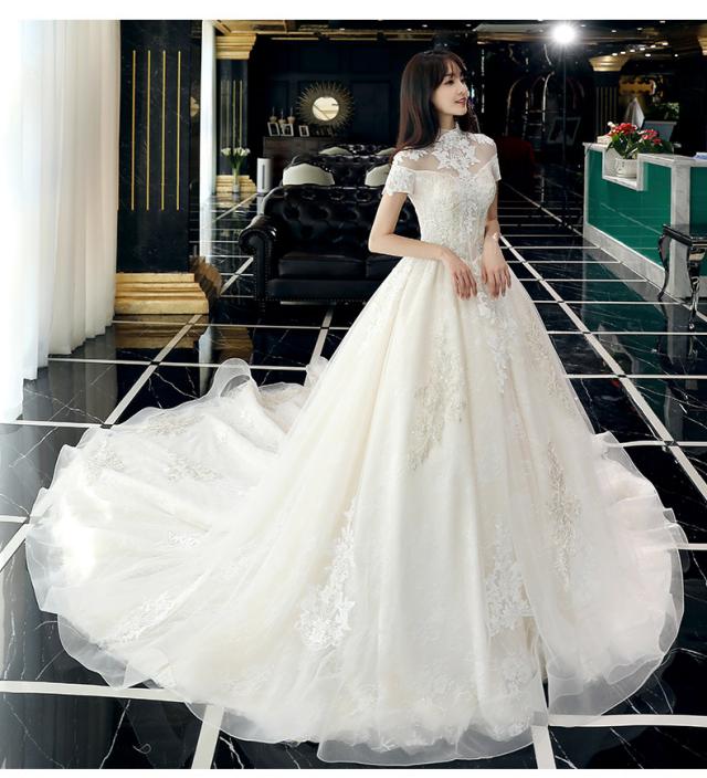 スタンドカラー 袖あり 半袖 刺繍 ヴィンテージ レース チュール 花 ロングドレス ウェディングドレス 花嫁ドレス 結婚式 二次会 披露宴 前撮り フォトウェディング スピンドル レースアップ 調節可能 ホワイト系 シンプル 大きいサイズ マタニティ L 2L 3L 4L 5L プリンセス 真珠