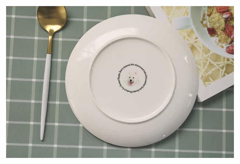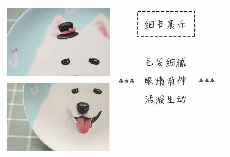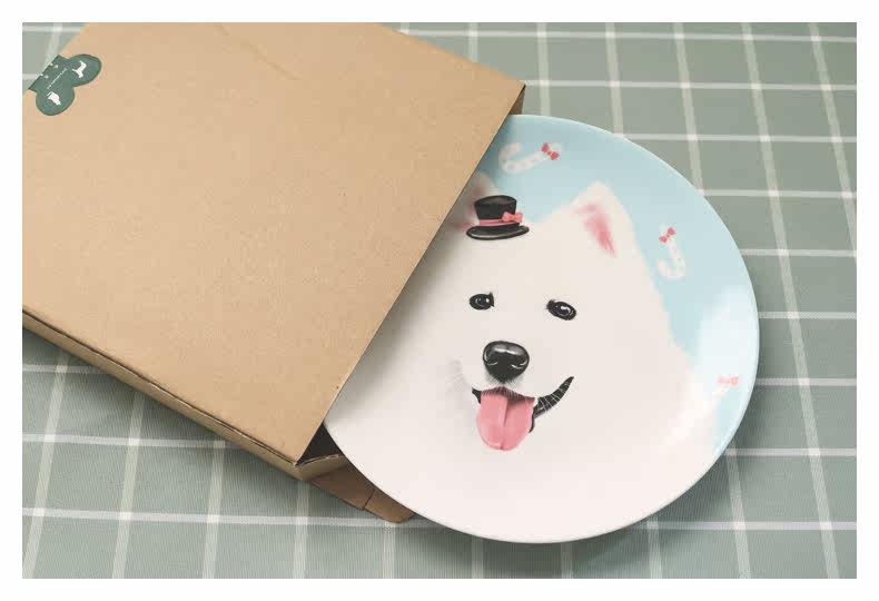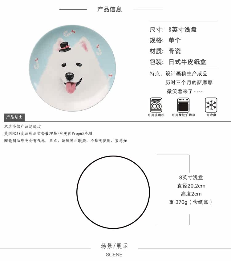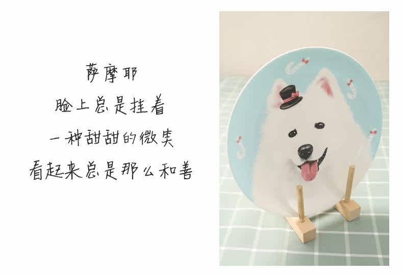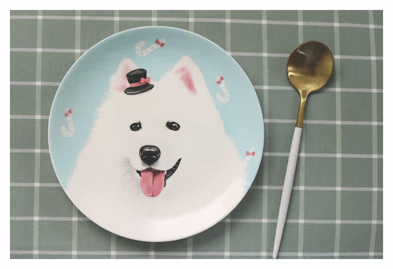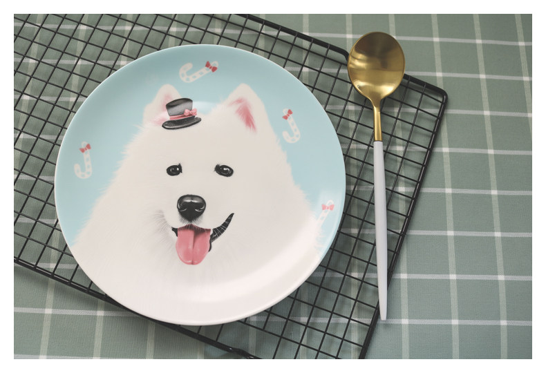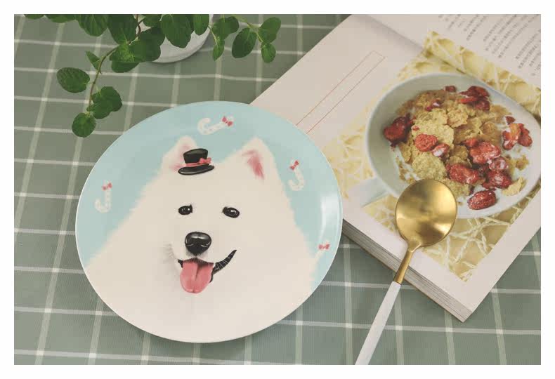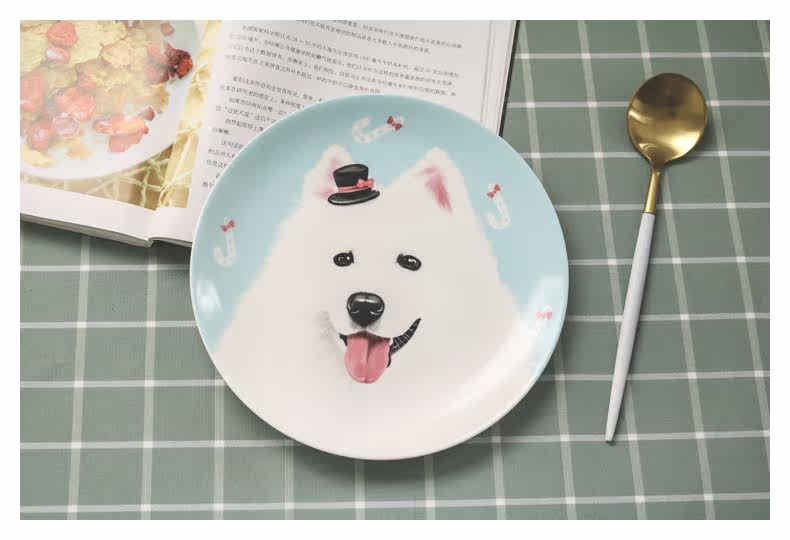 微笑天使萨摩耶陶瓷餐盘圆形西餐盘8英寸牛排盘子萌宠系家用餐具