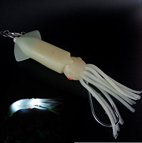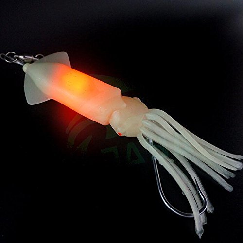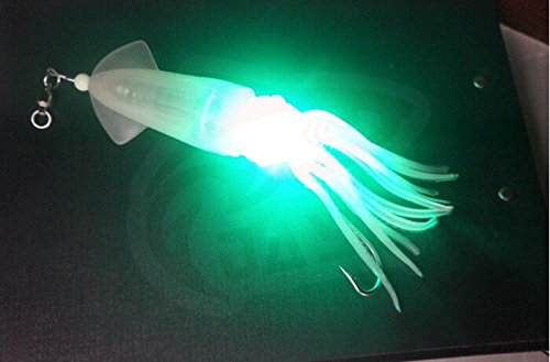 -. Feature : STRONG MATERIAL MADE. Crafted from tough vinyl, withstand abusing from those toothy, fierce monster species in the sea. / 98%-LIFELIKE APPEARANCE. Milky skin and skirt, Looks like almost a real squid swimming underwater, showing off its shining body to get all the focus from other fish, including those big ones eager for a big mean of course. / DOUBLE ATTRACTANTS: BUILT-IN LED & GLOW IN THE DARK SKIN. LED will be lighted on automatically when it hits the water with two electric poles explode to the water. Even the skirt tail will glow in dark environment. Please get the skin charged under light if the lure is under dark environment for too long. / PRE-RIGGED BALL BRARING SWIVEL, BRAID STEEL WIRE and 6/0 HOOK. Swim like no limit in the water within your control, assure premium hook setting always. / There are :White LED;Green LED;Red LED;Blue LED.you can choose.