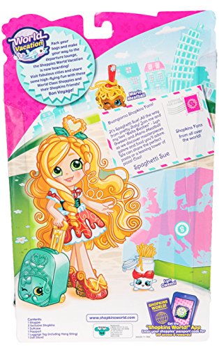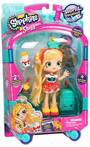 Each Shoppie comes with 2 Exclusive Shopkins, 1 suitcase, 1 Passport, 1 Luggage tag and 1 doll stand.