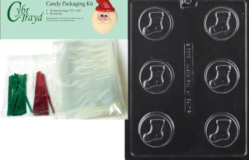 Cybrtrayd MdK50C-C462 Stocking Cookie Christmas Chocolate Mold with Chocolate Packaging Kit and Molding Instructions, Includes 50 Cello Bags, 25 Red and 25 Green Twist Ties