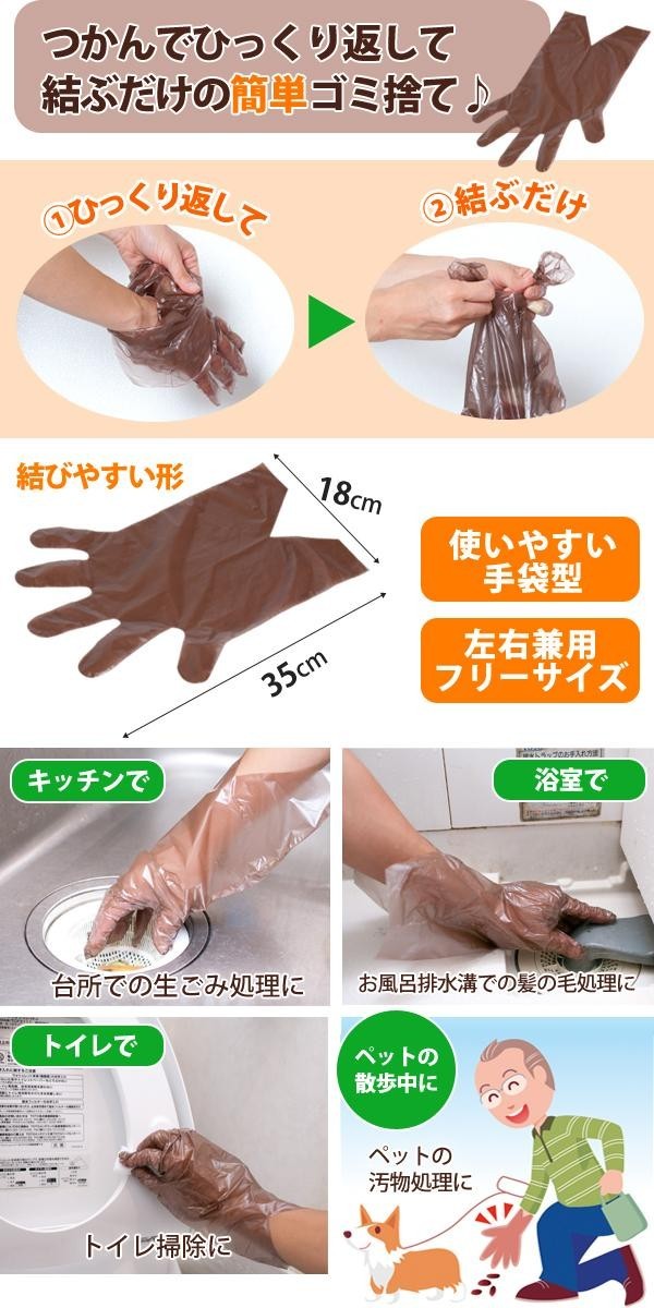 | ペットの汚物処理や生ごみ処理、トイレ・浴室などのお掃除に便利な手袋の形をしたゴミ袋です。ひっくりかえして、結ぶだけ!!そのままゴミ箱へポイッ♪消臭剤配合で、ニオイ成分をしっかり吸着!!燃焼しても有毒なガスは発生しません。 |