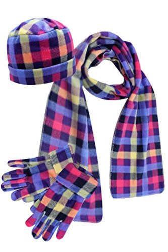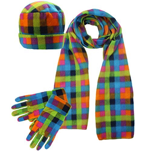 Studio : Luxury Divas Publisher : Luxury Divas Binding : Apparel Product Description This ultra soft and warm polar fleece scarf, gloves, and hat set features a vibrant, multi colored plaid pattern. This set includes a long scarf, with a matching hat and gloves. The gloves have a stylish folded cuff at the wrist. Luxuriously soft and warm, this 3 piece set for women is colorful enough to brighten up all your favorite outerwear. This hat, gloves, and scarf set is made of 100% polyester. The soft fleece material in this hat, gloves and scarf 3 piece set will keep you warm and toasty while looking great. This matching 3 piece set makes a great holiday gift, and gifting winter accessories delivers warm thoughts of appreciation whenever worn.