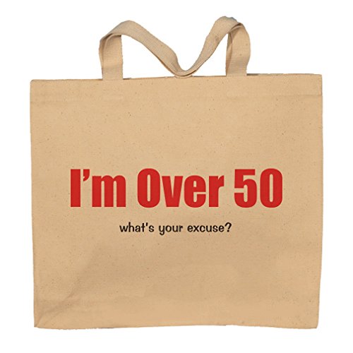 Binding : Apparel Product Description I'm Over 50 what's your excuse? . A Fun way to show how you feel with a totebag. The Design/Saying is printed on the front of this canvas tote bag. We use the newest best technology to print the design with great inks that are cured into the product. This new high tech way of producing garments is very fade resistant. WE DO NOT USE TRANSFERS. It is great, since you dont have that thick transfer feeling. The feel is very smooth and comfortable. 0