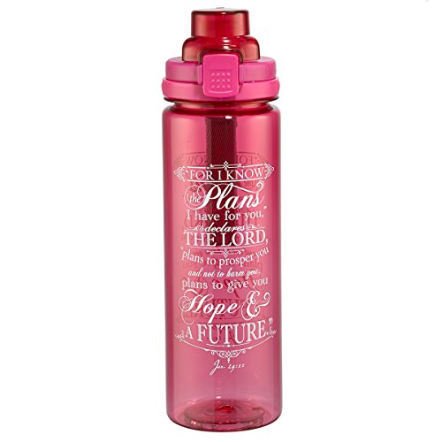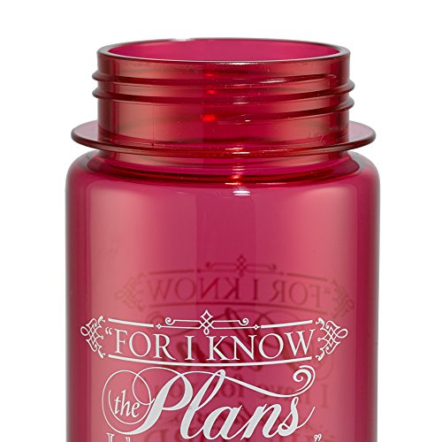 The "I Know the Plans" Pink Plastic Water Bottle has a 25 ounce capacity, a webbed loop for carrying and a plastic push-button, flip-top lid with a locking mechanism - simply rotate the ring to lock / unlock. The entire lid can be removed for washing. The bottle design features stylized text from Jeremiah 29:11 in contrasting white.Hand Wash Only