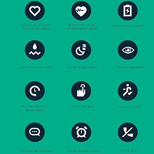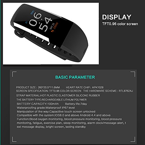 -. Feature : Color Screen :Color display.IP67 waterproof (can be used for swimming). / Sleep / Heart Rate/Blood Oxygen/Blood Pressure Monitor : Automatically Monitoring Sleep Duration and Sleep Quality and Heart Rate Blood Oxygen and Blood. / Sports Helper : Record your Movement Distance / Calorie Expenditure/Step Counter and Calorie Expenditure.Running identification (intelligent motion recognition) / Made of Nanometer material.Plug and play (no charge cable) / Suitable for Long-Term Wear ,Track GPS,Lasting power (charge 1 hour standby 30 days)