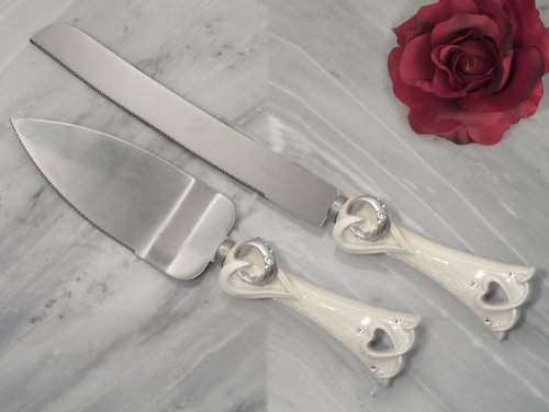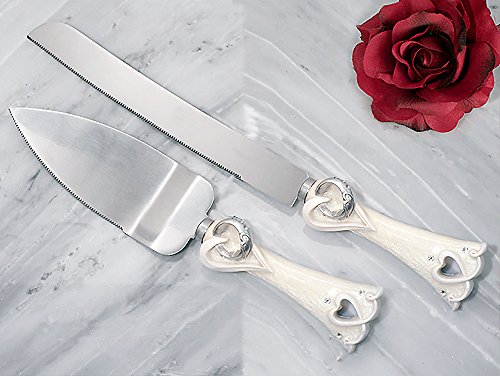 Studio : Cassiani Publisher : Cassiani Product Description We all want a piece of cake, everyone enjoys the special moment of watching the bride and groom cutting their wedding cake. We have the perfect accessory for that wonderful tradition. From Cassiani collections exclusive Two hearts become one accessories collection , a stylish design cake and knife server set. Each of these sturdy stainless steel cake and knife servers has a stylish open heart design with wedding rings entwined symbolizing you two hearts have now become one finished in our pearl white epoxy enamel finish.. The prefect touch to your elegant affair, the cake server measures 10" and the cake knife 12" long and come packaged in beautiful display gift box. 0