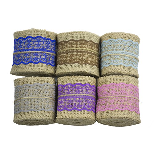 Aokbean Set of 6 Mixed Colors Natural Jute Burlap/Hessian Rolls Ribbon with Lace Ribbon 2.4" Wide 2.2 Yards Long for Craft Rustic Wedding Belt Strap Home Decor