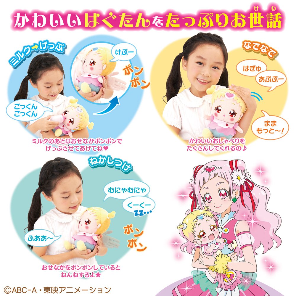 HUG(はぐ)っと!プリキュアより、プリキュアたちが育てることになった「はぐたん」のお世話ぬいぐるみが登場!頭なでなでや、ねかしつけ、ミルクあげなど、さまざまなお世話をすることで成長し、おしゃべりが変化する。ミライクリスタル1個付属。※購入特典は付属致しません。セット内容:はぐたん本体1体、ミライクリスタルホワイト1個、ほにゅうびん1個、キュプーン1本、取扱説明書1枚 使用電池:単4×2(別売) LR44×2(付属)