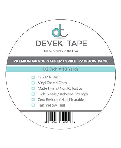Devek Professional's Choice Premium Spike Tape Matte Cloth With Rubber Adhesive 12.5 Mil Thick Rainbow Pack Tan, Yellow, Teal 1/2 Inch X 10 Yards