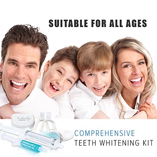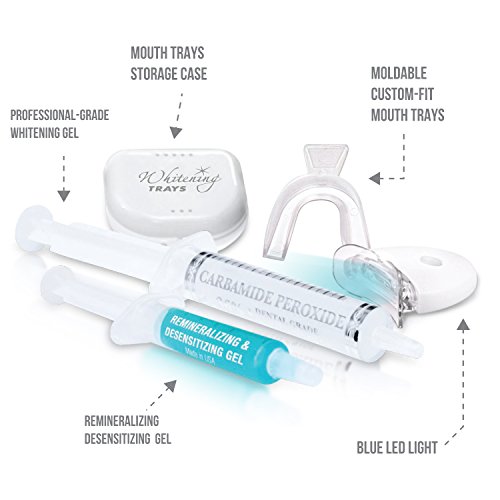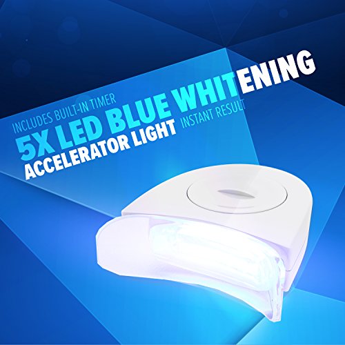 Complete kit comes with: 4 teeth whitening syringes, 2 remineralization gel syringes, applicator brush, LED Blue Light Accelerator, and teeth tray