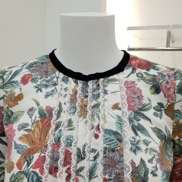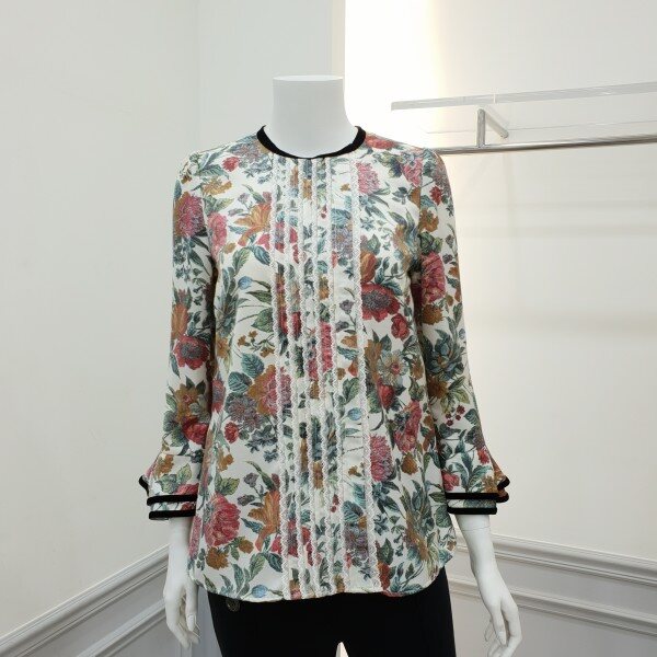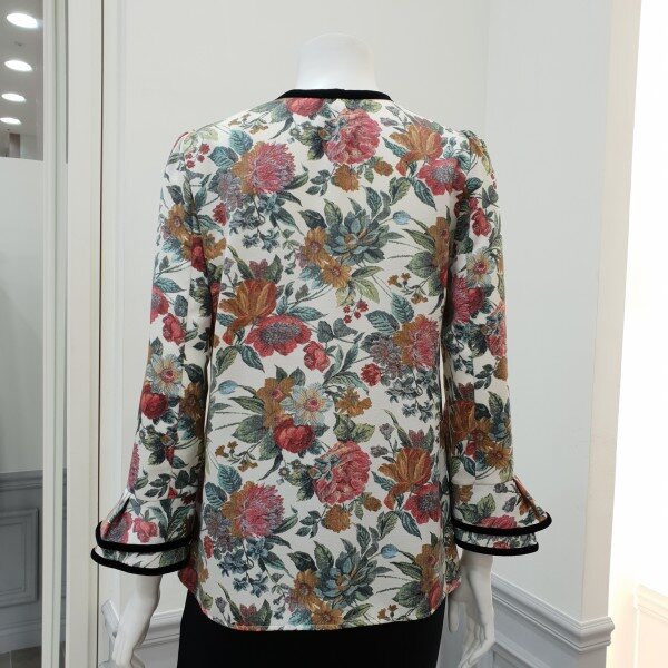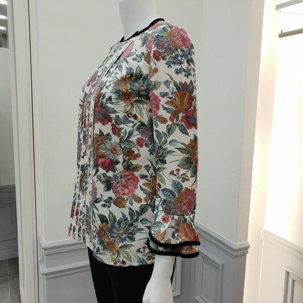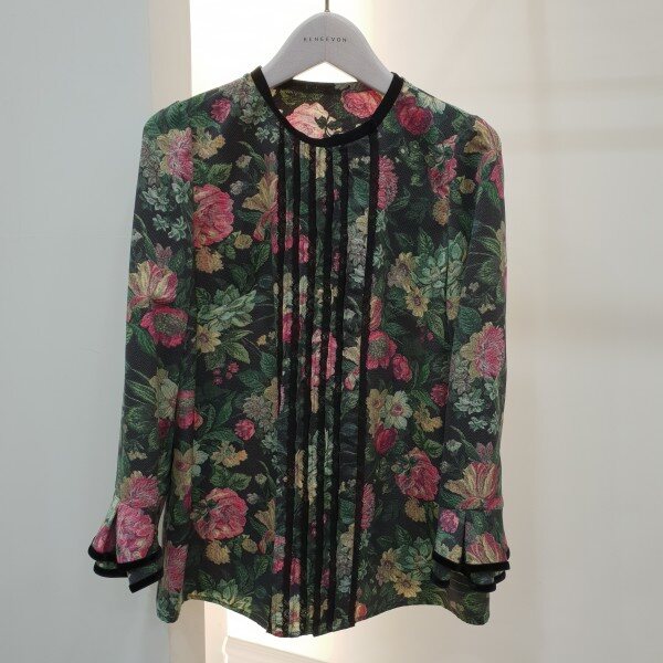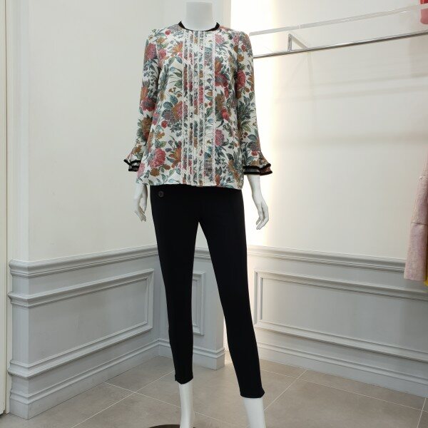 넥라인과소매프릴에 벨벳테이프로포인트를준 프린트블라우스입니다~♡토레이스와 핀턱으로 디테일을더했습니다~