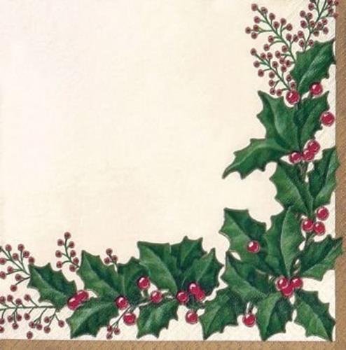 - 36-Count package of 3-ply paper napkins with festive Winter Holly design