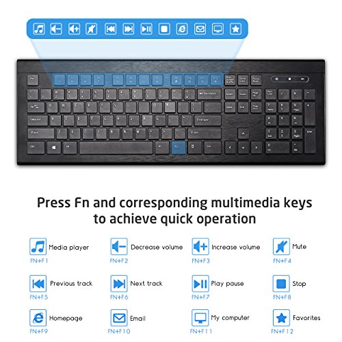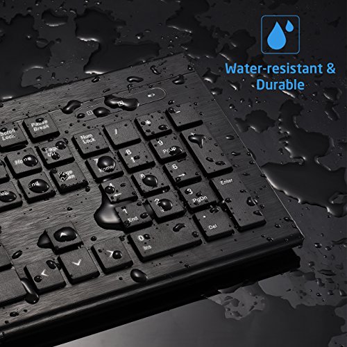 [Ultra-thin Design with Mute Mouse] The thinnest part of this keyboard is only 9mm, which make it sleek and elegant. Designed in simple business style, this keyboard comes with 104 keys in three zones(keyboard is note completely quiet) and an extra mute mouse, perfect for office use.