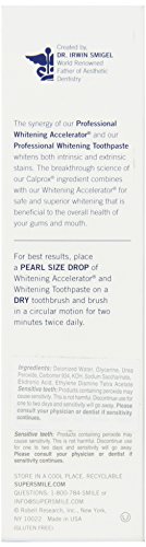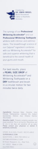 Studio : Robell Research, Inc Publisher : Robell Research, Inc Binding : Health and Beauty Product Description Supersmile Professional Whitening Accelerator gel with Calprox is the safest and healthiest way to whiten and re-mineralize teeth, without harmful bleaches, abrasives, or sensitivity. Works on types of dental restorations (caps, crowns, veneers, bonding). Supersmile Professional Whitening Accelerator safely whitens teeth below the enamel (intrinsic stains). Helps keep gums healthy and freshens breath. Maintains and enhances the vibrancy of professionally bleached teeth. Formulated with our proprietary ingredient Calprox, our formula works by gently dissolving the protein pellicle, a thin layer of protein that forms on the surface of teeth, to which plaque, bacteria, and stains adhere. Without the protein pellicle to latch onto, stains are brushed away leaving noticeably whiter teeth and a smoother surface. For best results use with the Professional Whitening Toothpaste and Professional Whitening Pre-Rinse. Supersmile is the number one teeth whitening brand recommended by cosmetic dentists. Made in USA. 0