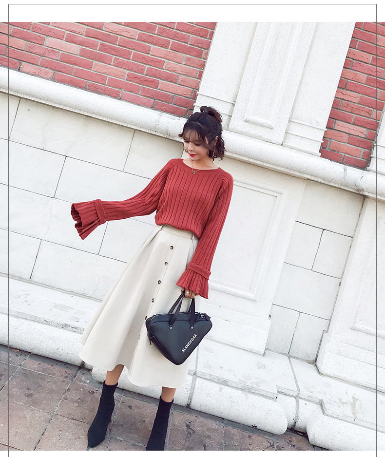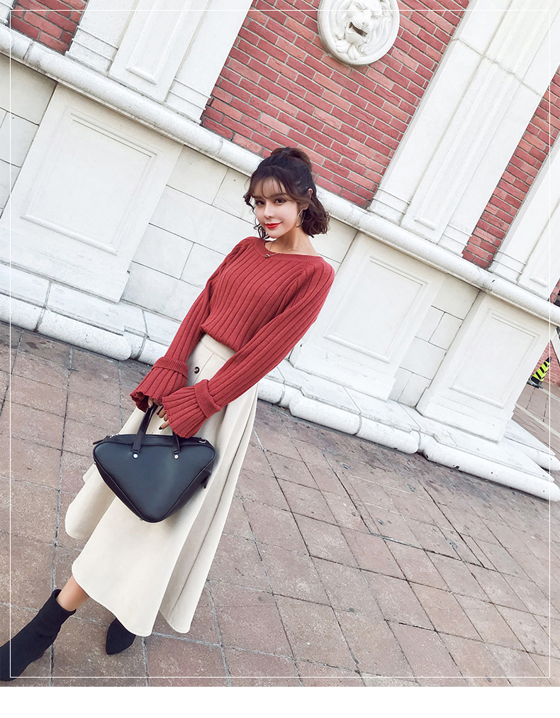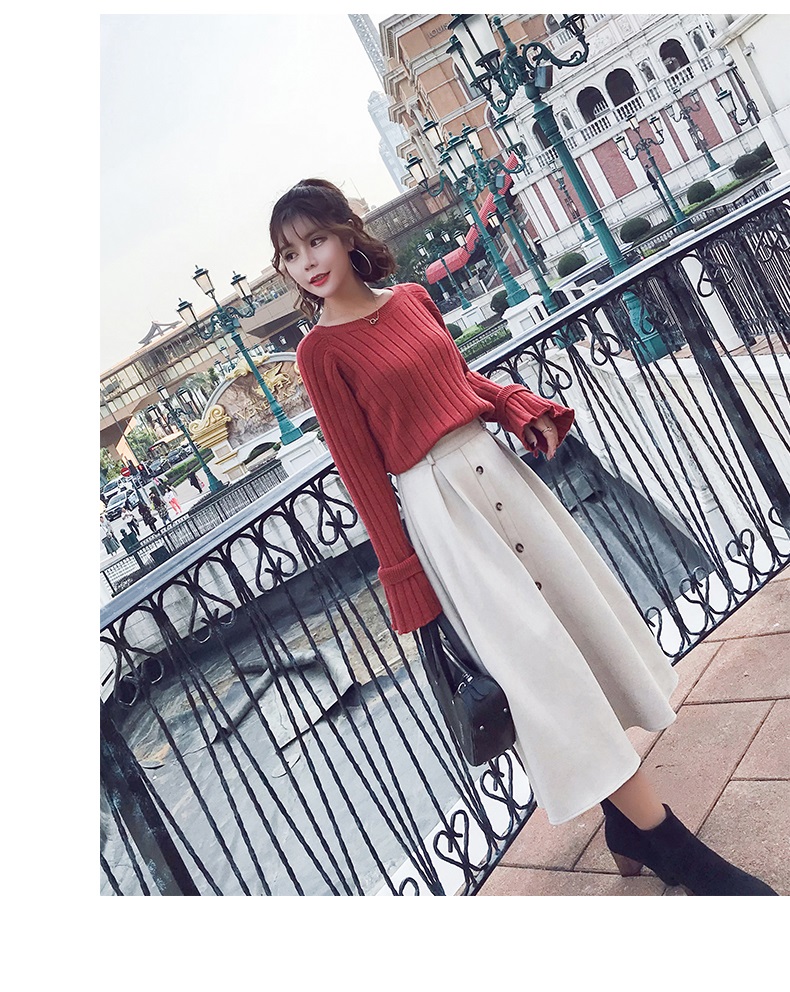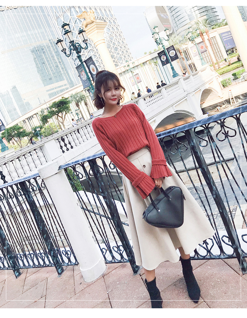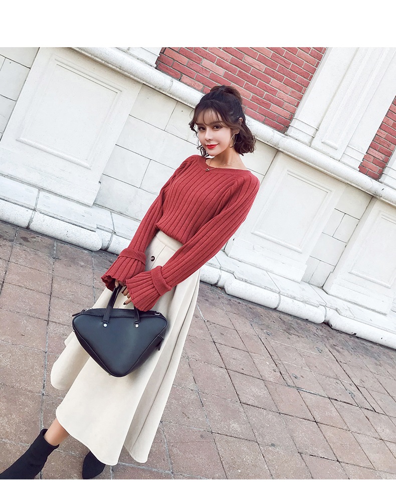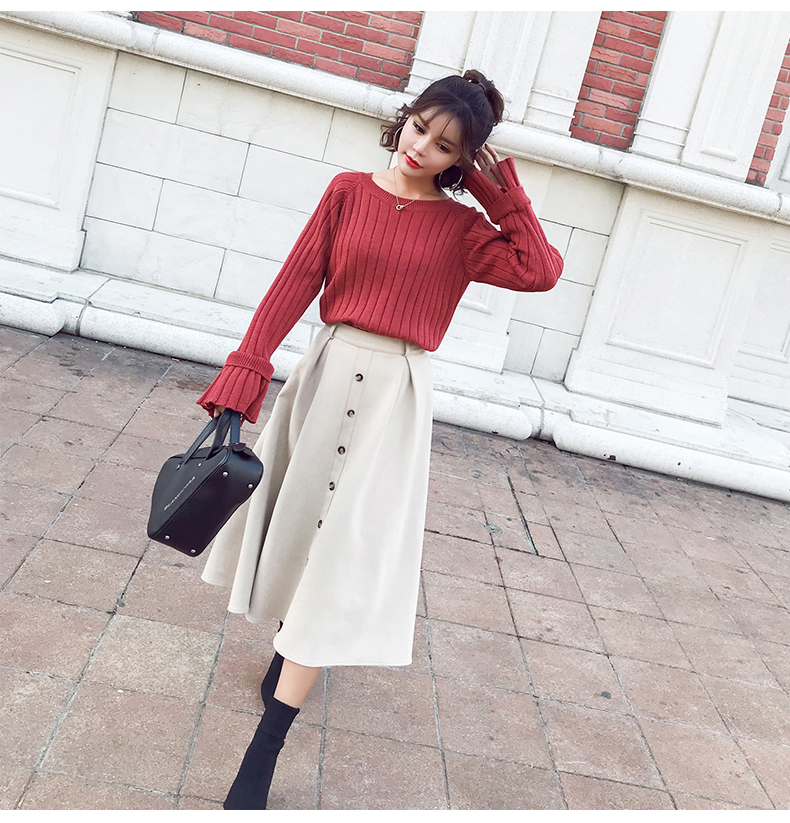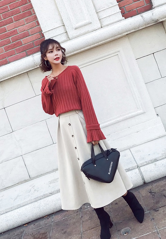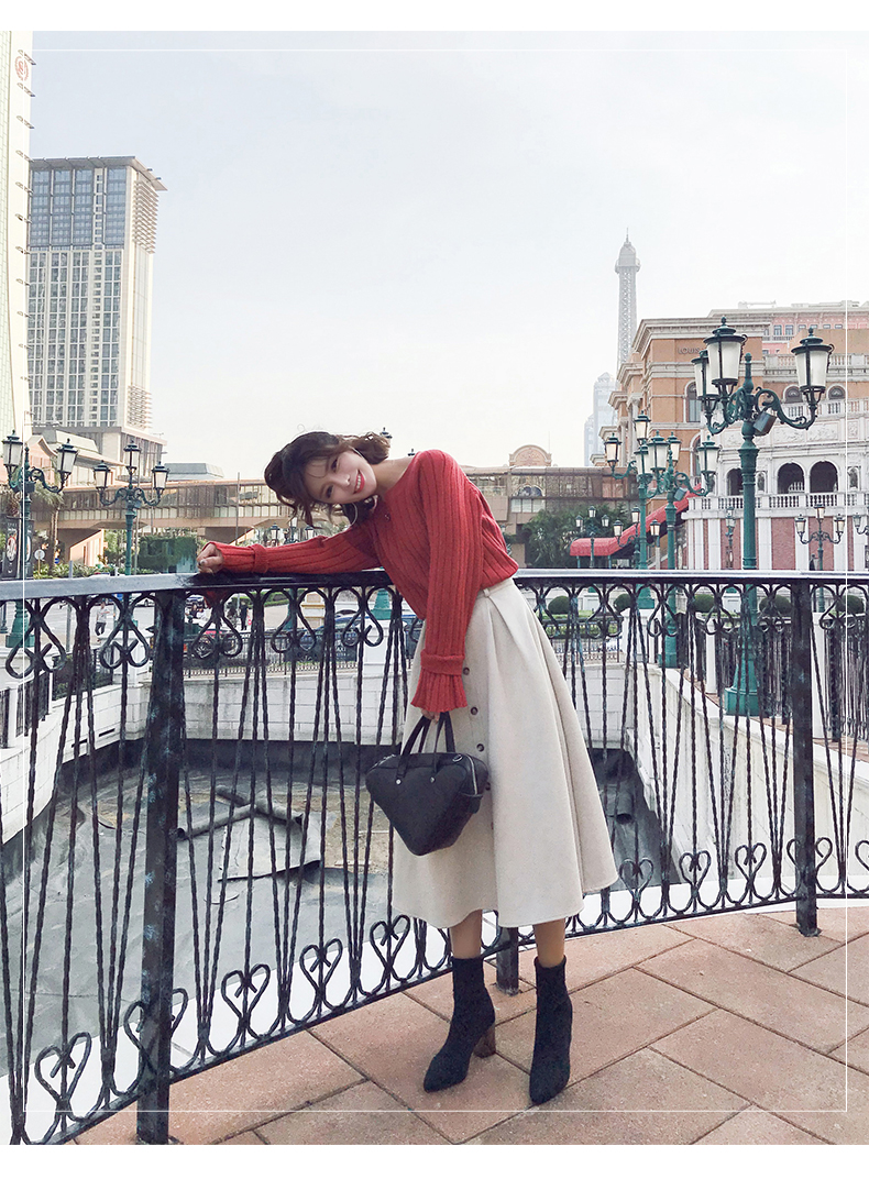 カジュアル、大人、秋、冬、もこもこ、ゆったりフィット、セットアップ、コーディネート、ニット、長そで、ロングスカート、フロントボタン、ベージュ、赤、レッド、さし色、ロング袖