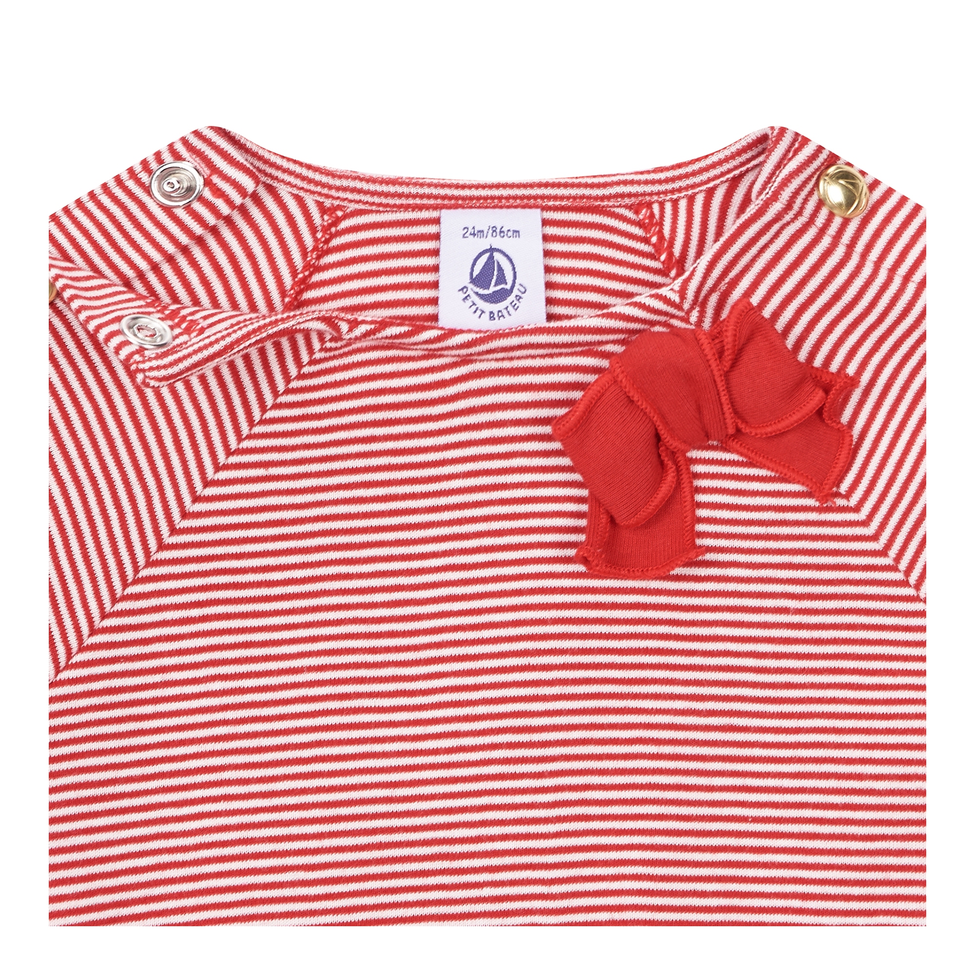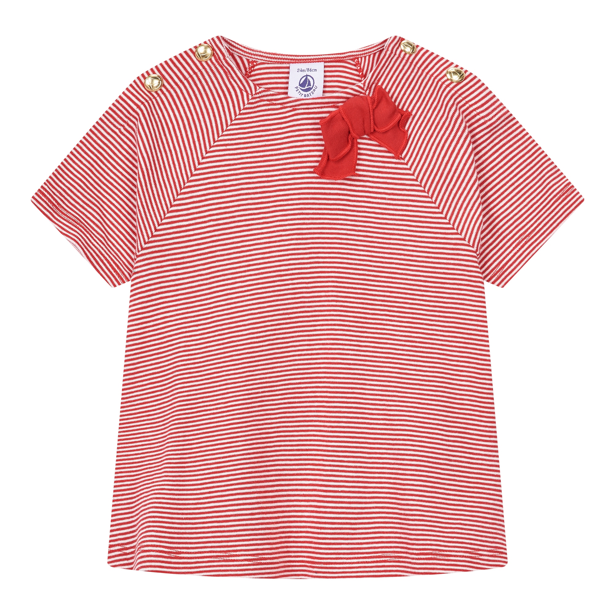 컬렉션 : 2018 Spring/Summer 디자인 포인트 : - 스트라이프 패턴 디테일이 돋보이는 캐주얼한 무드의 반팔 티셔츠- 어깨 부분에 골드 스냅 버튼 클로징이 있어 착용이 간편한 디자인- 리본 장식 디테일로 러블리함을 더한 아이템- 면 소재로 가볍고 부드러운 착용감을 자랑하는 상품 스타일링 추천 : 다양한 팬츠 혹은 레깅스 등의 아이템과 캐주얼한 스타일링을 연출 할 수 있음