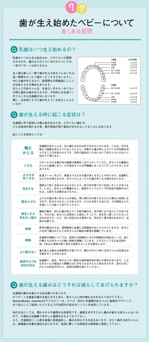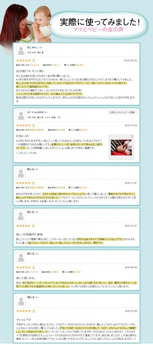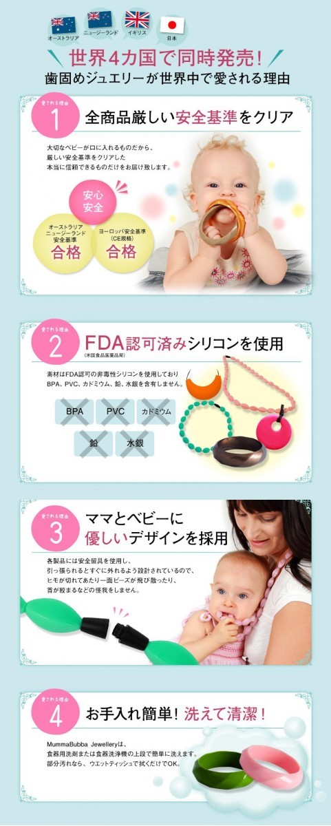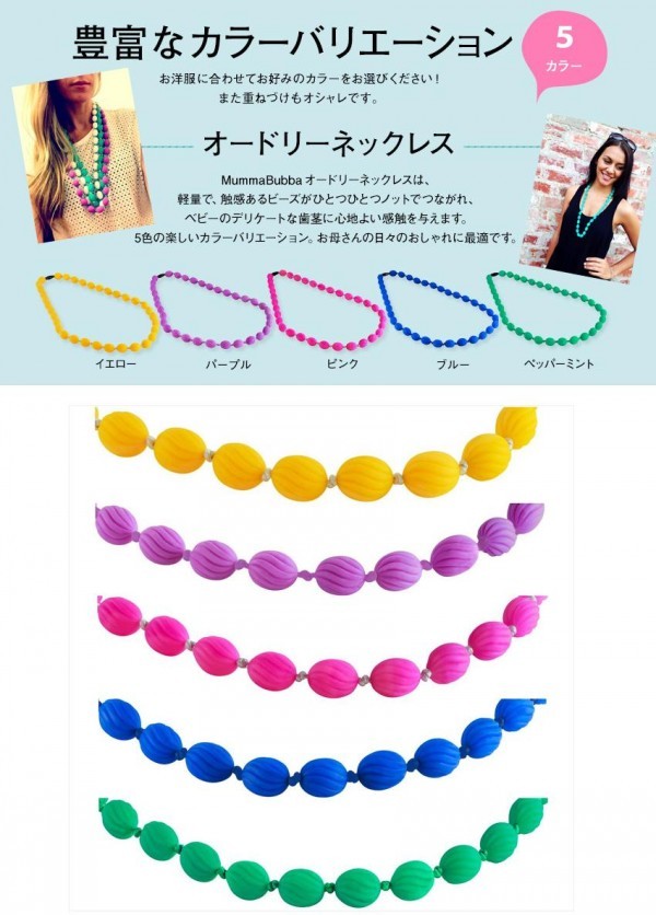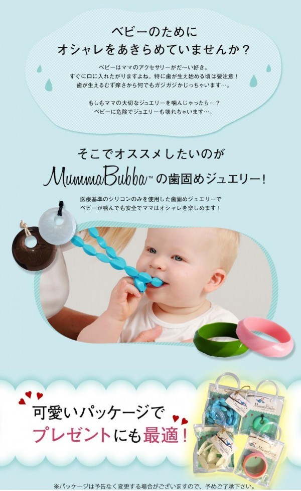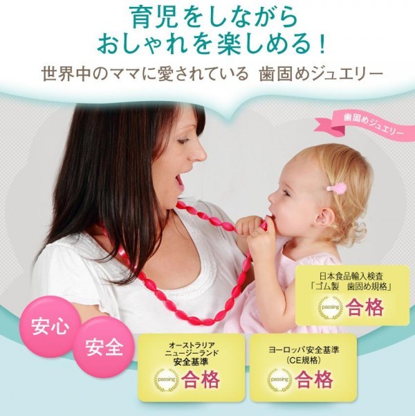 | 可愛いベビーが一緒でも、安心して身に着けられるアクセサリーの登場です!!医療基準のシリコンのみを使用した歯固めジュエリーでベビーが噛んでも大丈夫!!デザインもシンプルで、カラーも豊富なので、気分やお洋服に合わせてオシャレを楽しめます。もちろん洗うこともできますので、清潔にご使用いただけます。 |