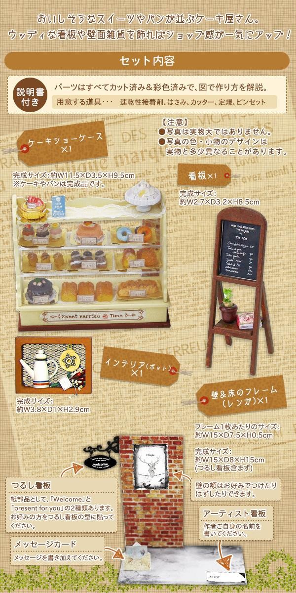 おいしそうなスイーツやパンが並ぶ素敵なケーキ屋さんのミニチュアキットです。ウッディな看板や壁面雑貨を一緒に飾って、おしゃれなショップを演出します。分かりやすい説明書付きなので、初心者の方でも楽しく簡単に作ることができます。 |