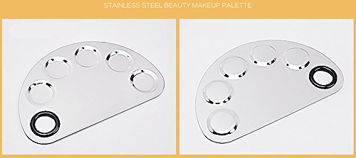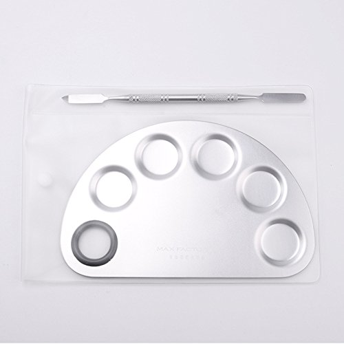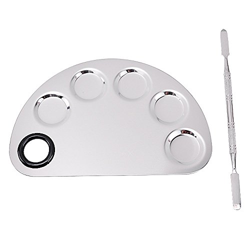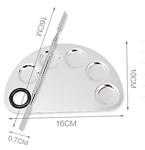 -. Feature : A stainless steel plaette with rounded edges and thumb hole / Ideal for blending colors and prevents cross contamination / The palette is excellent for mixing foundation, such as blending lip colors or eye shadow colors / Can be used with Nail Art Paint, Gels, Gel Polishes, Nail Polishes, Pigments, Lash Adhesive, etc. / Palette size: 16 x 10.5cm, Spatula size: 15 x 0.6cm