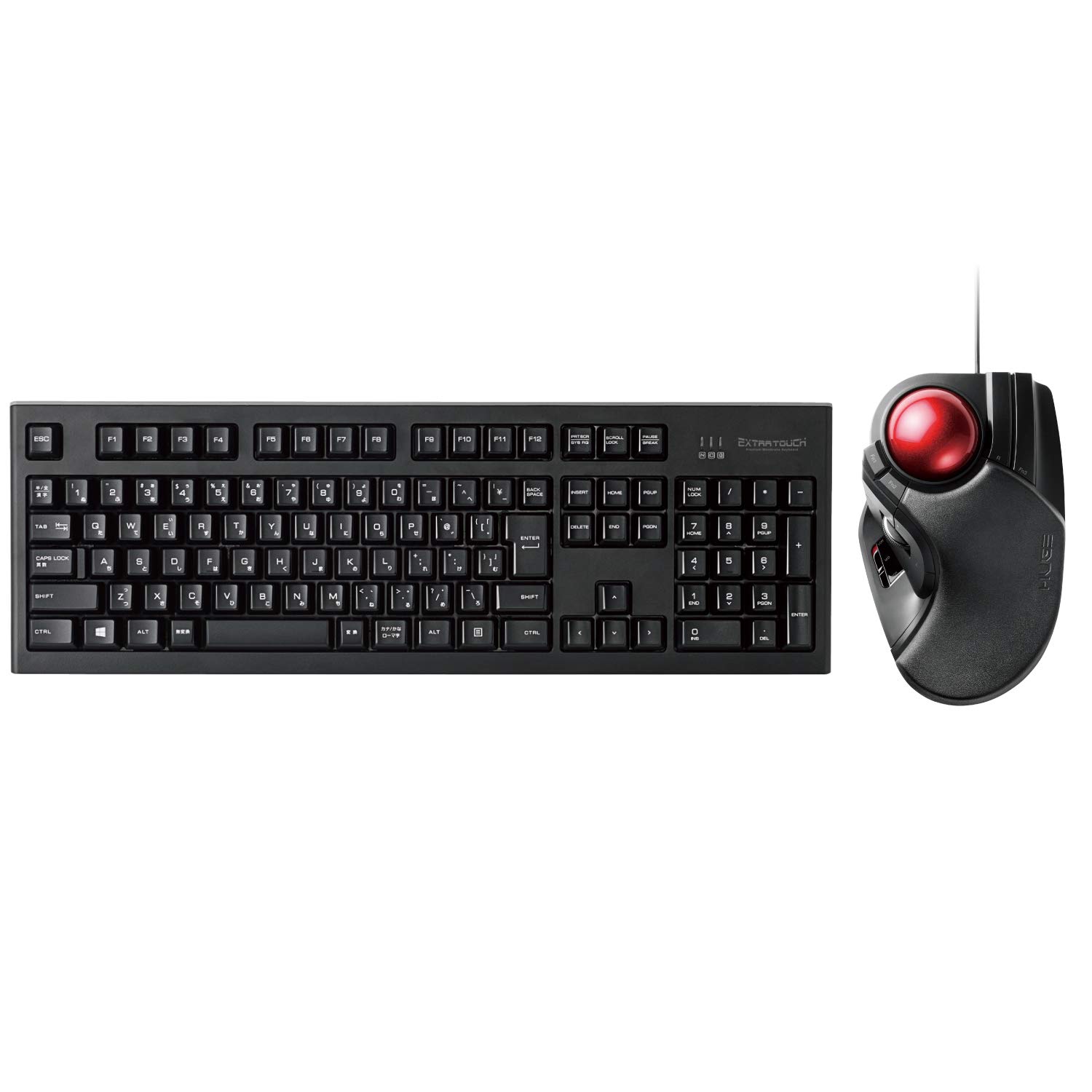 エレコム プレミアムキーボード ワイヤレス メンブレン 1000万回高耐久 ブラック TK-FDM088TBK と エレコム トラックボールマウス 有線 大玉 8ボタン チルト機能 ブラック M-HT1URXBKのセットです。 [キーボード特徴]メカニカルキーボードと同じキートップ設計を採用し、快適な打鍵感を実現! 最大1000万回のキーストロークにも耐えられる2.4GHzワイヤレスプレミアムメンブレンキーボード。 [マウス特徴]直径52mmの大型トラックボールが実現する想像を超えた操球感! 長時間のPC作業における手首への負担を軽減するパームレストを搭載した、人差し指・中指操作タイプのトラックボールマウス“HUGE”。