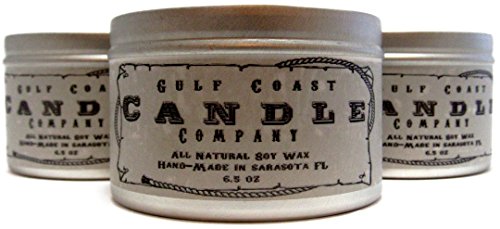 Each candle is in a 6.5 oz. tin and made of all-natural soy wax and essential oils