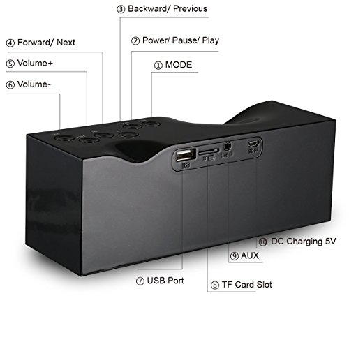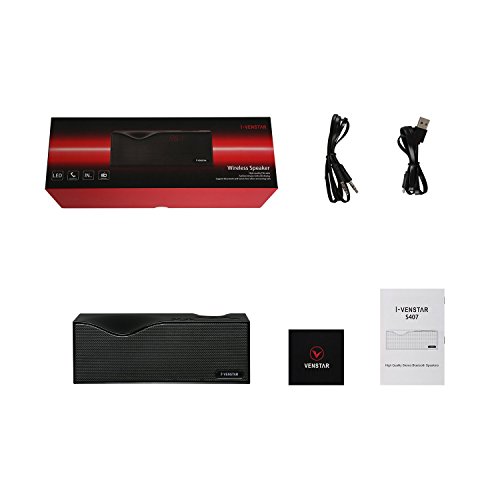 -. Feature : WIRELESS: Instantly set up connections with your phone via Bluetooth 3.0 technology and stream crystal clear sound from up to 33 feet away without cables. / PREMIUM SOUND & HANDS-FREE: Total 6W powerful acoustic drivers provide powerful, abundant stereo music surrounding you and built-in microphone enables you hands-free chat with friends. / LED DISPLAY & VERSATILE: Allow the music played via wireless Bluetooth, 3.5mm AUX-IN cable connection, Micro SD or a TF card pled, or even searching FM radio with red LED tunable display. / LONG PLAYTIME: Max up to 12 hours of continuous playback to keep you entertained by built-in 2600mAh rechargeable battery fully charged via Micro USB cable (included). / WHAT YOU GET: I-Venstar Bluetooth Speaker, 3.5mm Audio Cable, Micro-USB Flat Cable, User Manual & Warranty Card.