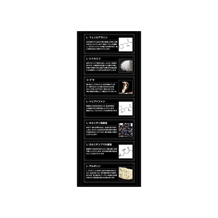 원재료:L-《시토루린》,브라 센터 엑기스(돼지를 포함한다)고, 동충하초균사체,전7(당근)인삼,《무이라푸아마》(지상부)엑기스말,캔 게 제비《요우에키스》말,은행나무잎 엑기스말,자라말,생강 엑기스말,로디 오라 엑기스말,갈 라《나》말,살무사말,《마카》말,식용 효모(아연 함유)/셀룰로오스,스테아린산 칼슘,활성탄,미립 산화 규소