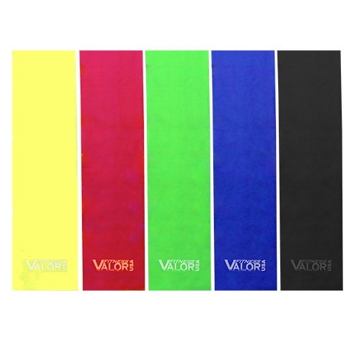 Studio : Valor Fitness Publisher : Valor Fitness Binding : Sports Product Description LB-Set Valor Fitness Latex Band Set: Latex bands measure in resistance from lightest to heaviest starting with LBY-1 (yellow) and ending with LBK-5 (black). Latex bands can be purchased as an entire set (5 bands) or individually. Bands measure approx. 8' long by 4.5"w. Latex bands may be small, but when they're stretched they provide tension that your muscles must overpower. If you don't have access to a gym or to weights at home, latex bands can provide an inexpensive and portable way to strength train. You can target all the major muscles in your body with the bands to improve your strength and endurance. Resistance: Yellow = Light Red = Medium Green = Medium-Heavy Blue = Heavy Black = Extra Heavy. 0